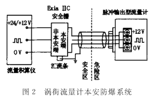 LUB系列渦街流量計防爆等級為ExiaⅡCT2~T4,它必須與已取得防爆合格證的本安關(guān)聯(lián)設(shè)備(防爆標志:ExiaⅡC)配套組成本安防爆系統(tǒng)。如圖2所示。