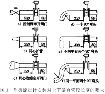 b)渦街流量計對安裝點上下游直管段的*小長度要求根據(jù)現(xiàn)場情況各不相同,如圖3所示。