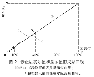 如上所述的基本策略實(shí)際上就是修正了40%以下的流量系數(shù)和修正了 70%以上的流量系數(shù)。用圖1表示就是改變了40%以下的流量指示值曲線的斜率和70%以上的流量指示值曲線的斜率。