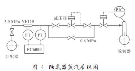 在現(xiàn)場了解情況時(shí),儀表人員觀察到了流量計(jì)示值突然跳高的現(xiàn)象。從記錄紙上可清楚看出,測量范圍為0~10t/h的除氧器耗汽流量,正常時(shí)在3t/h左右波動(dòng),*高時(shí)也未高于5t/h;但在異常情況發(fā)生后,流量示值突然跳到10t/h以上并長時(shí)間維持此值。儀表人員立即到蒸汽分配器處觀察,發(fā)現(xiàn)去除氧器的一路蒸汽管有異常的振動(dòng),管內(nèi)壓力有周期性的小幅度擺動(dòng)。儀表人員又到除氧器處觀察,其蒸汽系統(tǒng)如圖4所示。