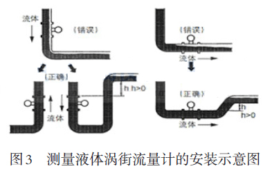 測量液體時(shí)為保證測量精確,渦街流量計(jì)的管道必須充滿液體。渦街流量計(jì)安裝在水平管道上時(shí),應(yīng)將下游段的管道高于渦街流量計(jì),以保持滿管;當(dāng)流體向下流動(dòng)時(shí),應(yīng)將下游段的管道高于渦街流量計(jì),以保持滿管。流量計(jì)安裝在垂直管道上時(shí),流體應(yīng)該向上流動(dòng),當(dāng)流體向下流動(dòng)時(shí),應(yīng)將下游段的管道高于渦街流量計(jì),以保持滿管,如圖3所示。