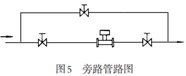 為了方便地檢查和清洗流量計(jì)(漩渦發(fā)生體),安裝如圖5所示的旁通管道。對于初次投運(yùn)或管線設(shè)備檢修后,開車時(shí)應(yīng)先使工藝介質(zhì)走旁路24小時(shí),待介質(zhì)干凈時(shí)開表,以防變送器被異物阻塞或變送探測器被損壞。