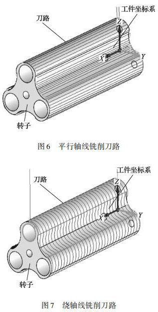 三葉轉(zhuǎn)子的曲面是由多條直線組成的直紋面,加工三葉轉(zhuǎn)子這種高精度的直紋曲面必須采用四軸或五軸聯(lián)動(dòng)的數(shù)控機(jī)床。三葉轉(zhuǎn)子的銑削方式有刀具路徑平行軸線銑削、繞軸線銑削兩種刀具路徑。平行軸線銑削原理為: 刀具在轉(zhuǎn)子曲面上沿 X軸從轉(zhuǎn)子的一端移動(dòng)到另一端銑出一條直線,銑削下一點(diǎn)位時(shí)旋轉(zhuǎn) A 軸 Z 軸聯(lián)動(dòng)再次從轉(zhuǎn)子一端銑削到另一端,采用往復(fù)銑削直到完成整個(gè)轉(zhuǎn)子曲面,刀具路徑如圖 6 所示。繞軸線銑削原理為: 刀具在轉(zhuǎn)子曲面上 AZ 軸聯(lián)動(dòng)刀具繞 A 軸軸線銑削,銑削下一點(diǎn)位時(shí)移動(dòng) X 軸,再次 AZ 軸進(jìn)行聯(lián)動(dòng)銑削,采用往復(fù)銑削直到完成整個(gè)轉(zhuǎn)子曲面,刀具路徑如圖 7 所示。由于繞軸銑削需要 AZ 軸聯(lián)動(dòng)切削,而數(shù)控機(jī)床可以達(dá)到的進(jìn)給率是由*慢的軸決定的,所以,這種刀具路徑在精加工高速銑削時(shí)并不適用。