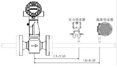 智能蒸汽流量計的口徑如果與工藝管道相同,不能滿足流量儀表要求時,或者在此流速下測量準確度不能保證時,需要縮小儀表口徑,從而提高管內(nèi)流速,保證測量精度。上下游必須有足夠的直管段,若傳感器安裝點的上游在同一平面上有 2 個 90°彎頭時,上游直管段≥25D,下游直管段≥5D。根據(jù)測量的需要,需在智能蒸汽流量計附近測量壓力和溫度時,測壓點應在傳感器下游的(3 ~5)D 處,測溫點應在傳感器下游的(6 ~8)D 處,如圖 3 所示。