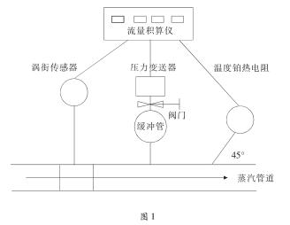 蒸汽作為重要的二次能源廣泛應(yīng)用于工業(yè)生產(chǎn)當(dāng)中。蒸汽的計量是蒸汽使用過程中重要的一環(huán),蒸汽流量計的準(zhǔn)確性關(guān)系到供、用雙方的經(jīng)濟(jì)利益。蒸汽流量計又是由多個計量器具組成的一個計量系統(tǒng)。而蒸汽流量計大都安裝在高溫、高壓的蒸汽管道上,不方便拆卸,如何提高蒸汽流量計現(xiàn)場檢測技術(shù)就變得非常重要。目前常見的用于計量蒸汽的流量計一般有兩種:渦街流量計和差壓式流量計。渦街流量計主要由渦街流量傳感器、流量積算儀、壓力變送器、溫度鉑熱電阻組成。差壓式流量計主要由標(biāo)準(zhǔn)孔板、差壓變送器、流量積算儀、壓力變送器、溫度鉑熱電阻等組成。渦街流量計由于其結(jié)構(gòu)簡單、牢固、安裝維護(hù)方便。目前在市場上的應(yīng)用越來越廣泛。渦街流量計安裝示意圖如圖1: