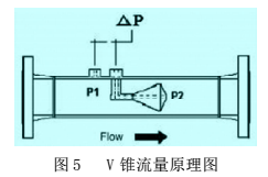 (1)V錐流量計(jì):V錐流量計(jì)(V-cone flowmeter)是美國(guó)富沃得公司在20世紀(jì)80年代開始研發(fā)的一種差壓流量計(jì),它的開發(fā)成功是差壓式流量測(cè)量質(zhì)的飛躍。它利用V錐體在流場(chǎng)中產(chǎn)生的節(jié)流效應(yīng),通過檢測(cè)上下游壓差來測(cè)量流量。與普通節(jié)流件相比,它改變了節(jié)流布局,從中心孔節(jié)流改為環(huán)狀節(jié)流,工作原理如圖5。