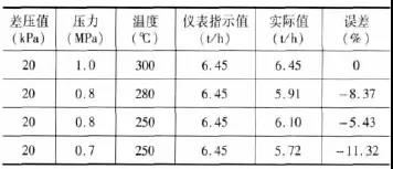 表1是在同一管道中用同一個孔板及相同的測量設備對同一種蒸汽所測得的一組數(shù)據(jù)。從中可以看出,在相同的差壓下,由于蒸汽的溫度和壓力的變化,即蒸汽密度的變化,相同的差壓所對應的流量是不同的。以1.0MPa蒸汽計量為例,只有在蒸汽的物理條件完全符合設計條件(1.0MPa、300℃)時,儀表指示的示值才是真實的實際流量值。
