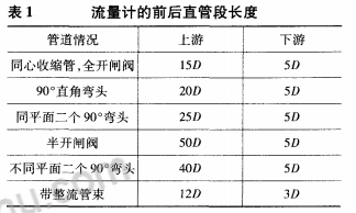 2)要求流量計(jì)的前后要有一定的直管段,直管段的長度應(yīng)符合表1的要求(其中D為管道直徑)。在規(guī)定的直管段長度內(nèi),管道入流段與出流段目測應(yīng)是平直的。為保證被測介質(zhì)滿管,流量計(jì)應(yīng)盡量避免安裝在調(diào)節(jié)閥、半開閘閥的下游。一般情況下不在擴(kuò)大管后安裝流量計(jì)。如果流量測量時(shí)需要進(jìn)行溫度或壓力補(bǔ)償時(shí),取壓點(diǎn)應(yīng)在流量計(jì)前l(fā)D以外,測溫點(diǎn)應(yīng)在流量計(jì)后5D以外。