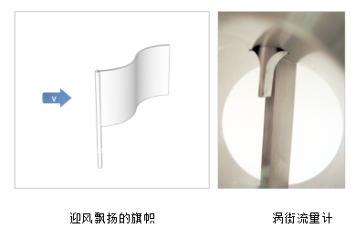 自然界的很多現(xiàn)象都源于渦街原理,比如迎風飄揚的旗幟,旗桿作為漩渦發(fā)生體, 當風從旗桿一側吹來時,旗桿阻擋了風,分別從旗桿兩側吹過的氣流在其后形成了漩渦,因此,旗幟能夠隨風飄揚。在渦街流量計中,正是采用了“卡門渦街原理”,測量管中有一個漩渦發(fā)生體,漩渦的脫落頻率正比于流量,漩渦脫落頻率通過傳感器中的壓電晶體來測量,公式如下: