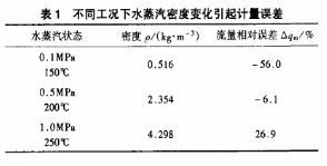 假如設(shè)計(jì)孔板流量計(jì)時是按照0.5MPa所對應(yīng)的飽和水蒸氣密度ρ設(shè)=2.667kg/m³設(shè)計(jì)的,則在不同工況下所產(chǎn)生的誤差如表1。