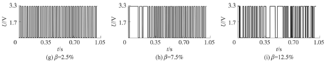 試驗發(fā)現(xiàn),氣相的加入對氫氣流量計測量的影響顯著,譜分析和脈沖計數(shù)兩種方法隨著氣相注入的增加其表現(xiàn)也不同。圖4反映了水流量12m3/h時,注入不同氣含率β時A點的模擬信號,如圖4(a~c)所示;經(jīng)譜分析后得到的頻率值,如圖4(d~f)所示;用脈沖計數(shù)方法得到的脈沖信號,如圖4(g~i)所示。圖4顯示,當注入氣量不大時,對氫氣流量計的影響不大,無論是譜分析結(jié)果還是脈沖計數(shù)得到的結(jié)果都比較好。當注入的氣量進一步增加時,渦街原始信號強度和穩(wěn)定性逐漸變差,渦街頻率信號會被干擾信號所淹沒,反映到譜分析圖是,渦街頻率的譜能量減小,干擾信號的譜能量加強;對于脈沖信號,會因為一些旋渦信號減弱,形成脈沖缺失現(xiàn)象,而不能真實地反映渦街產(chǎn)生的頻率。