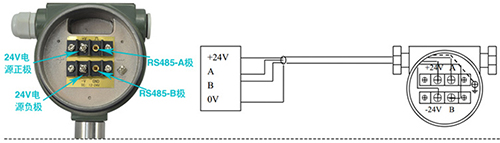 帶RS-485通訊功能的渦街流量計(jì)采用DC24V電源供電,與其它設(shè)備之間采用四線(xiàn)制傳輸方式。儀表端子接線(xiàn)見(jiàn)圖