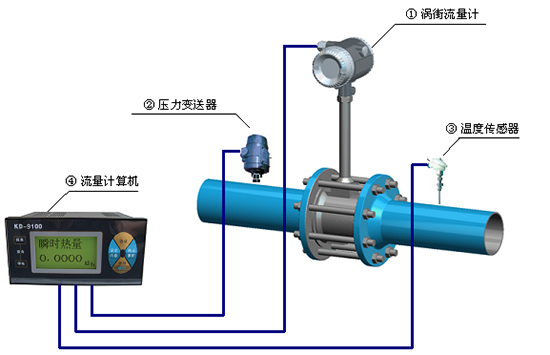 分體式渦街流量計由流量傳感器、溫度傳感器、壓力傳感器和智能流量顯示積算儀四部分組成,具有智能溫度、壓力補(bǔ)償功能,由智能流量顯示積算儀遠(yuǎn)程顯示介質(zhì)溫度(℃)、工作壓力(MPa)、瞬時標(biāo)況體積流量(m3/h)和累計標(biāo)況體積流量(m3)。