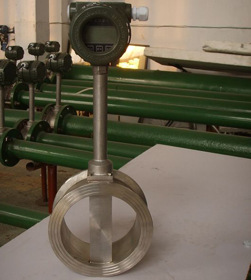 在流體管道中,垂直插入一個柱形阻擋物,在其后部(相對于流體流向)兩側就會交替地產生旋渦。隨著流體向下游流動形成旋渦列,我們稱之為卡門渦街。我們把產生旋渦的柱形阻擋物定義為旋渦發(fā)生體實驗證明,在一定條件下旋渦的分離頻率與流體的流速成線性關系。因而,只要檢測出旋渦分離的頻率,即可計算出管道內流體的流速或流量。渦街流量計即是根據(jù)這一原來制造。
